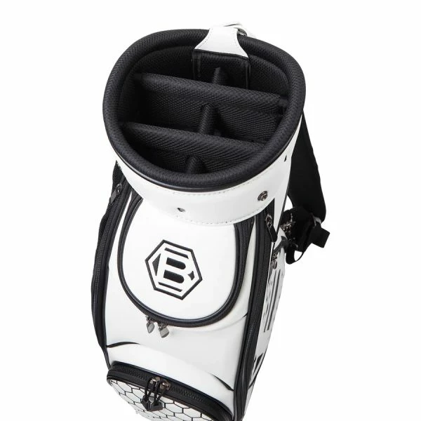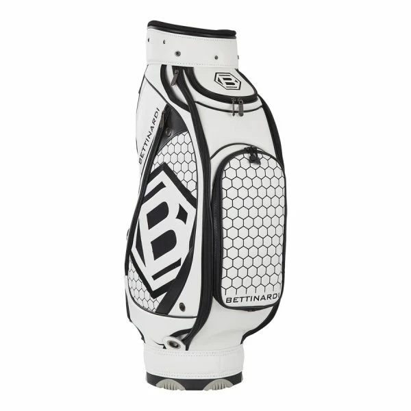 The Ltd Release Bettinardi Golf Staff Bag features a beautiful honeycomb pattern throughout the panels and features a Hex B on the sides and at the top. This 6-way bag is adorned in a tonal blue colourway and features a combination of leather and carbon fibre elements throughout, including numerous zippered pockets, and a matching rain hood.