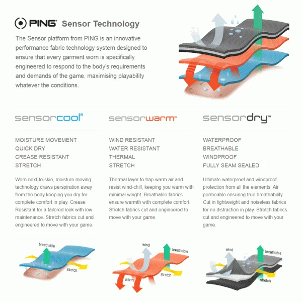 From the moment Karsten Solheim invented the PING 1-A putter back in 1959 we’ve been a leading innovator in golf. Engineered exclusively for golfers, PING apparel combines the latest technology, state-of-the art fabrics and production methods, alongside luxury materials and craftsmanship, to provide unrivaled quality and performance. Our Sensor technology platform consisting of SensorCool, SensorWarm and SensorDry fabrications protect against the elements to deliver enhanced comfort in all playing conditions.