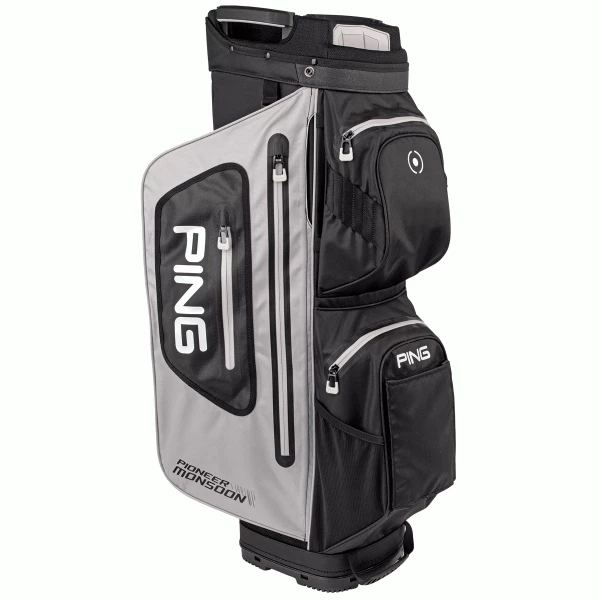 The Ping Pioneer Monsoon is a full featured waterproof golf cart trolley bag with a 15 way top divider system and a moulded putter slot to fit oversize putter grips. Fully sealed with taped waterproof seams, the bag weighs in at just 2.8 KG making it a lightweight alternative to the standard Ping Pioneer bag. New integrated lift handles maximizes club management and 12 seam sealed pockets offer plenty of storage.
