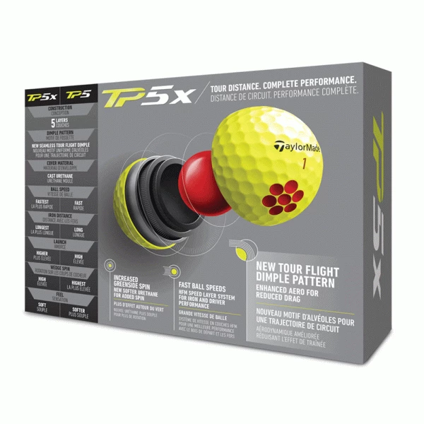 The new TaylorMade TP5x Golf Balls feature a Tour Flight Dimple Pattern with shallower dimples that reduce drag during ascent, and steeper dimples that maintain lift during descent. By reducing resistance while the ball travels to its apex, and maintaining elevation as it falls to its target, the new TP5x’s improved aerodynamics vastly improve carry distances in comparison to previous models. To further magnify distance, a series of four increasingly stiff layers improve energy transfer from the core to the cover. Known as the HFM Speed Layer System, this crucial component ensures that none of your club head speed goes to waste. Simply put, the new TP5x literally outdistances its predecessors.